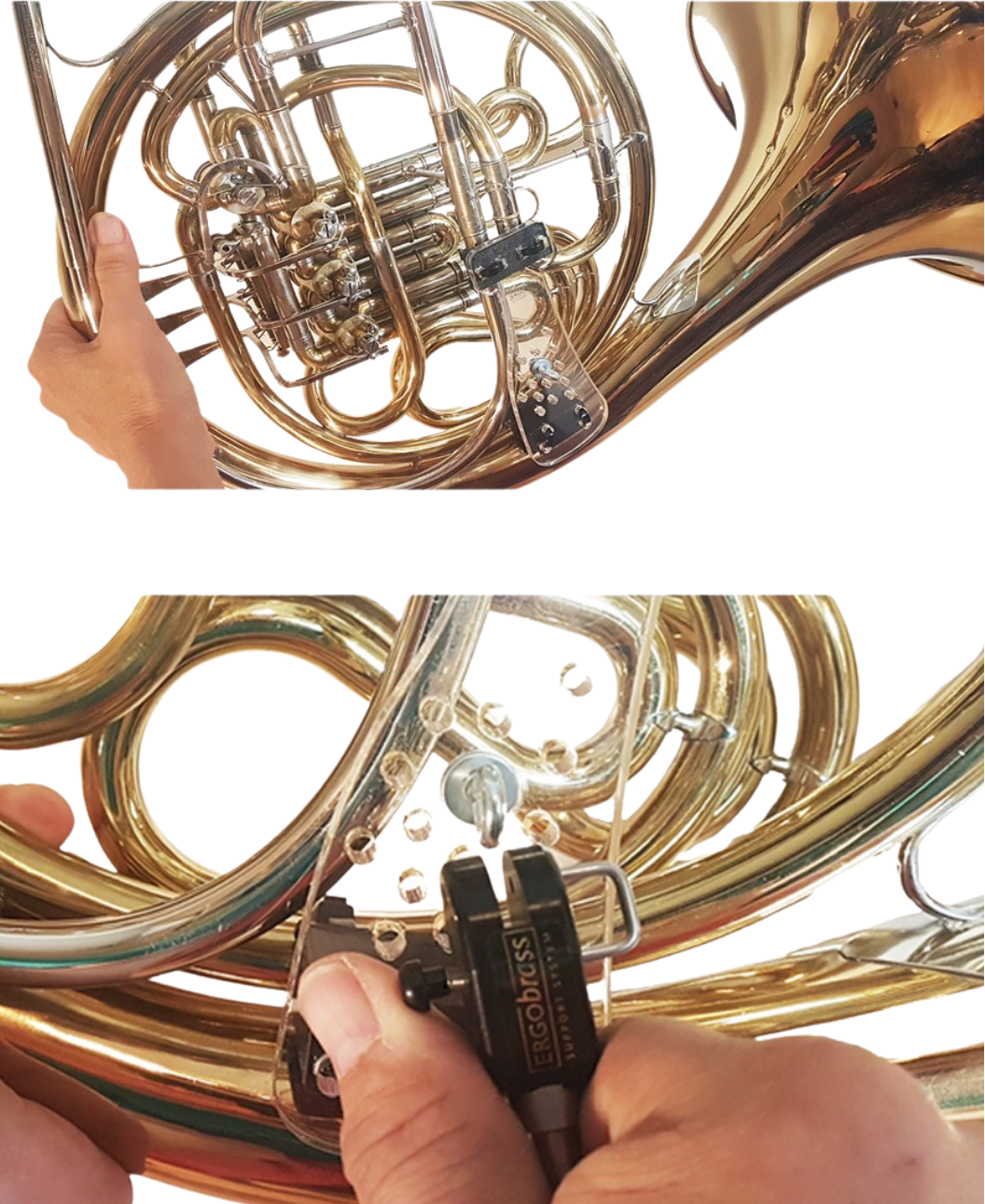 You need to attach a clear plastic plate permanently to your horn with flexible plastic ties. There are two different plate options available, see our FAQ and video page for more info. The plate is cushioned with soft paddings to protect your instrument surface. The plate has several holes so that you can find the right one for best balance.